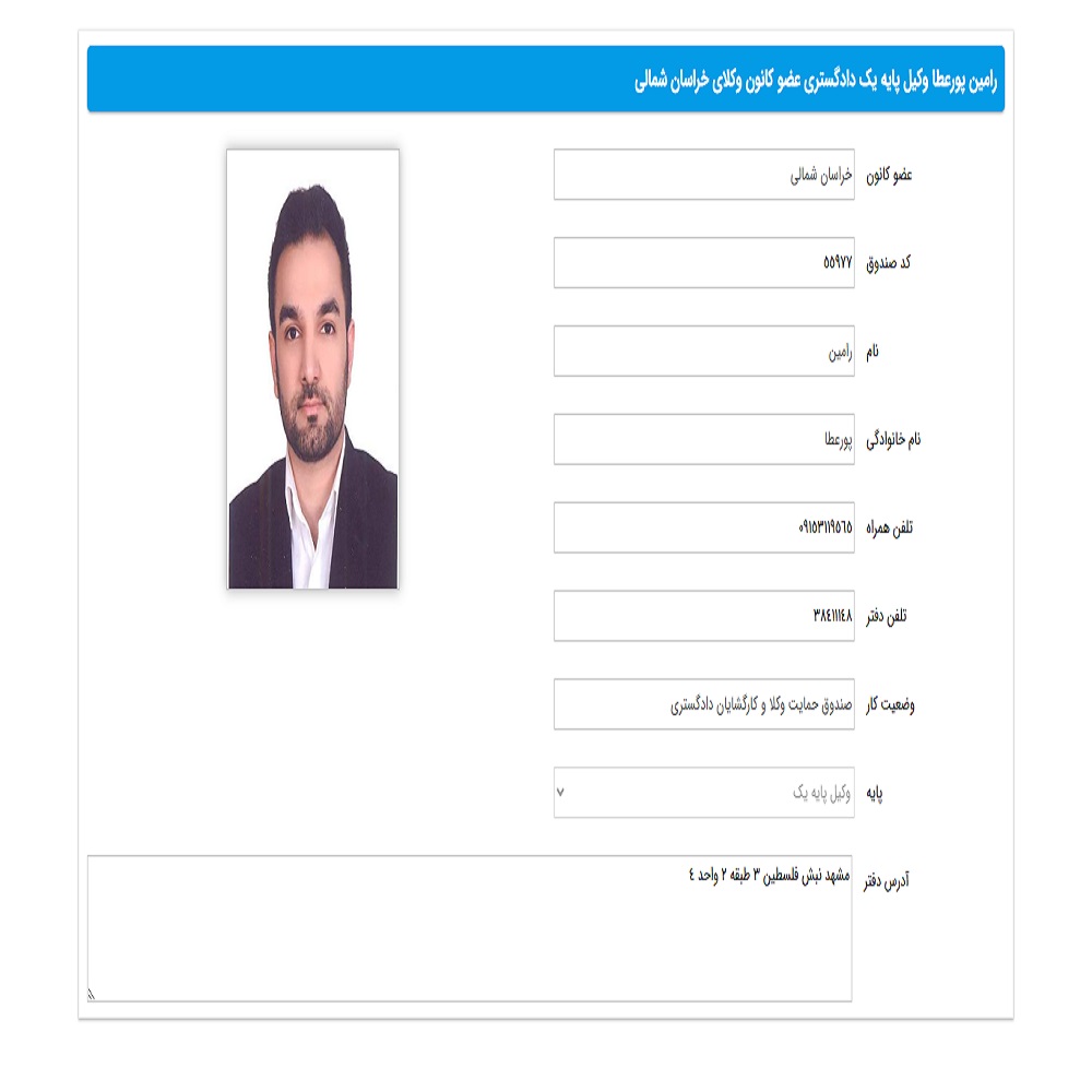 آقای رامین پورعطا، وکیل پایه یک دادگستری مشهد و عضو کانون وکلای دادگستری، دارای مدرک کارشناسی ارشد حقوق از دانشگاه تهران و دانشآموخته دکتری رشته حقوق هستند. ایشان سابقه چندین سال فعالیت در حوزههای خانواده، دعاوی کیفری و دعاوی ملکی را دارا هستند. همچنین عضو کمیسیون حقوق بشر کانون وکلای خراسان و بنیاد ملی نخبگان میباشند. در پروندهها علاوه بر وکالت، خدماتی مانند تنظیم قرارداد، لایحه کیفری و دفاعیه را نیز ارائه میدهند