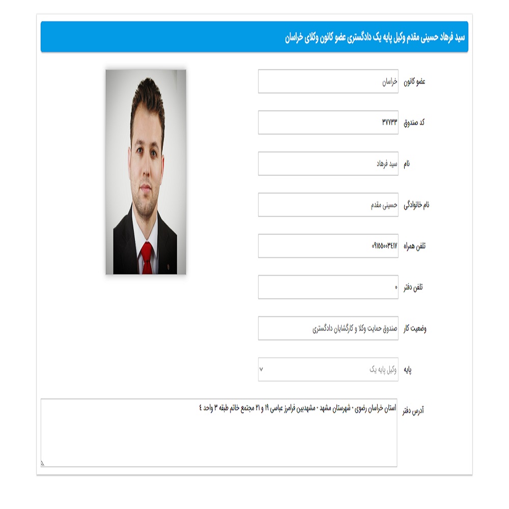 آقای سید فرهاد حسینی مقدم دارای 10 سال سابقه کاری، وکیل پایه یک دادگستری و مشاور حقوقی هستند. ایشان عضو کانون وکلای دادگستری استان خراسان رضوی بوده و قادرند در زمینههای مختلف حقوقی و کیفری به موکلان خود خدمات وکالتی ارائه دهند. لازم به ذکر است که آقای حسینی مقدم به صورت غیرحضوری و آنلاین هم مشاوره حقوقی ارائه میدهند.