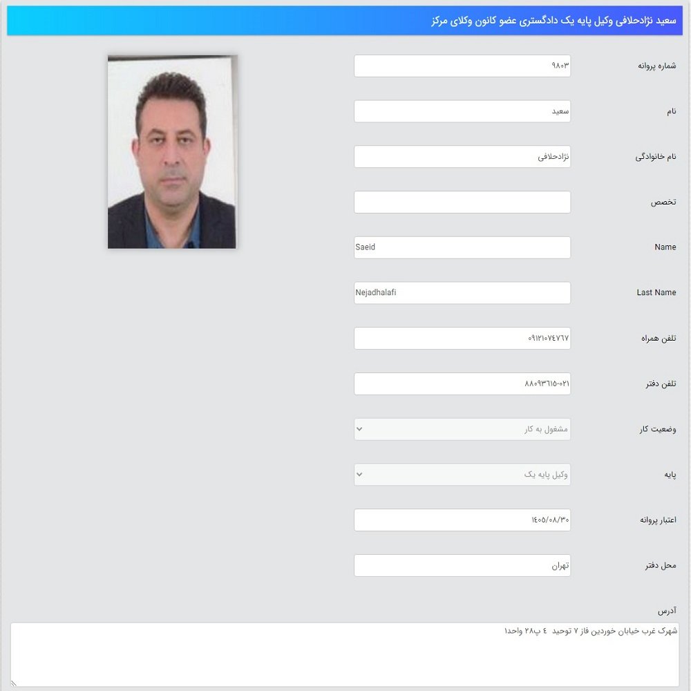 آقای سعید نژاد حلافی، وکیل پایه یک دادگستری و مشاور حقوقی با 22 سال تجربه در زمینه وکالت کیفری و حقوقی است. ایشان مدرک دکترای حقوق عمومی را از دانشگاه معتبر دریافت کرده و در طی این سالها توانسته است بهعنوان یکی از وکلای برجسته در تهران شناخته شود. تخصص وی در زمینههای مختلف حقوقی و کیفری موجب شده تا بسیاری از افراد حقیقی و حقوقی برای مشاوره و وکالت به ایشان مراجعه کنند. آقای حلافی با حفظ حرفهایگری و پایبندی به اصول اخلاقی، به ارائه خدمات حقوقی در حوزههای مختلف ادامه میدهد.