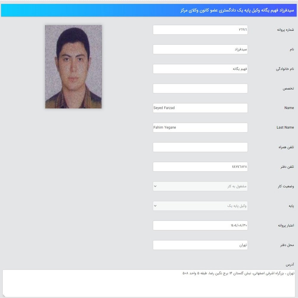 آقای فرزاد فهیم یگانه، وکیل پایه یک دادگستری و متخصص در زمینههای حقوقی مختلف، با تسلط به قوانین و مقررات، خدمات حقوقی گستردهای به مراجعین خود ارائه میدهد. ایشان باسابقه طولانی در زمینه وکالت، بهعنوان یکی از وکلای برجسته در غرب تهران شناخته میشوند. آقای فهیم یگانه با تخصص در دعاوی کیفری و حقوقی، بهویژه در پروندههای پیچیده، توانسته است با ارائه مشاورههای دقیق و راهبُردهای مؤثر، رضایت موکلین خود را جلب کند.