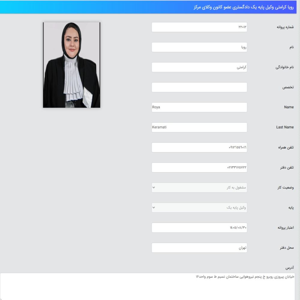 رویا کرامتی، فارغ التحصیل از دانشگاه شهیدبهشتی، عضو کانون وکلای دادگستری مرکز، شهر تهران، دارای 12 سال سابقه وکالت در امور ملکی، خانواده، کیفری و برخی پرونده های سیاسی؛ کارشناس حقوقی صداوسیما بوده و در شبکه های دو و جام جم و …. به صورت زنده پاسخگوی سوالات عزیزان بوده اند.