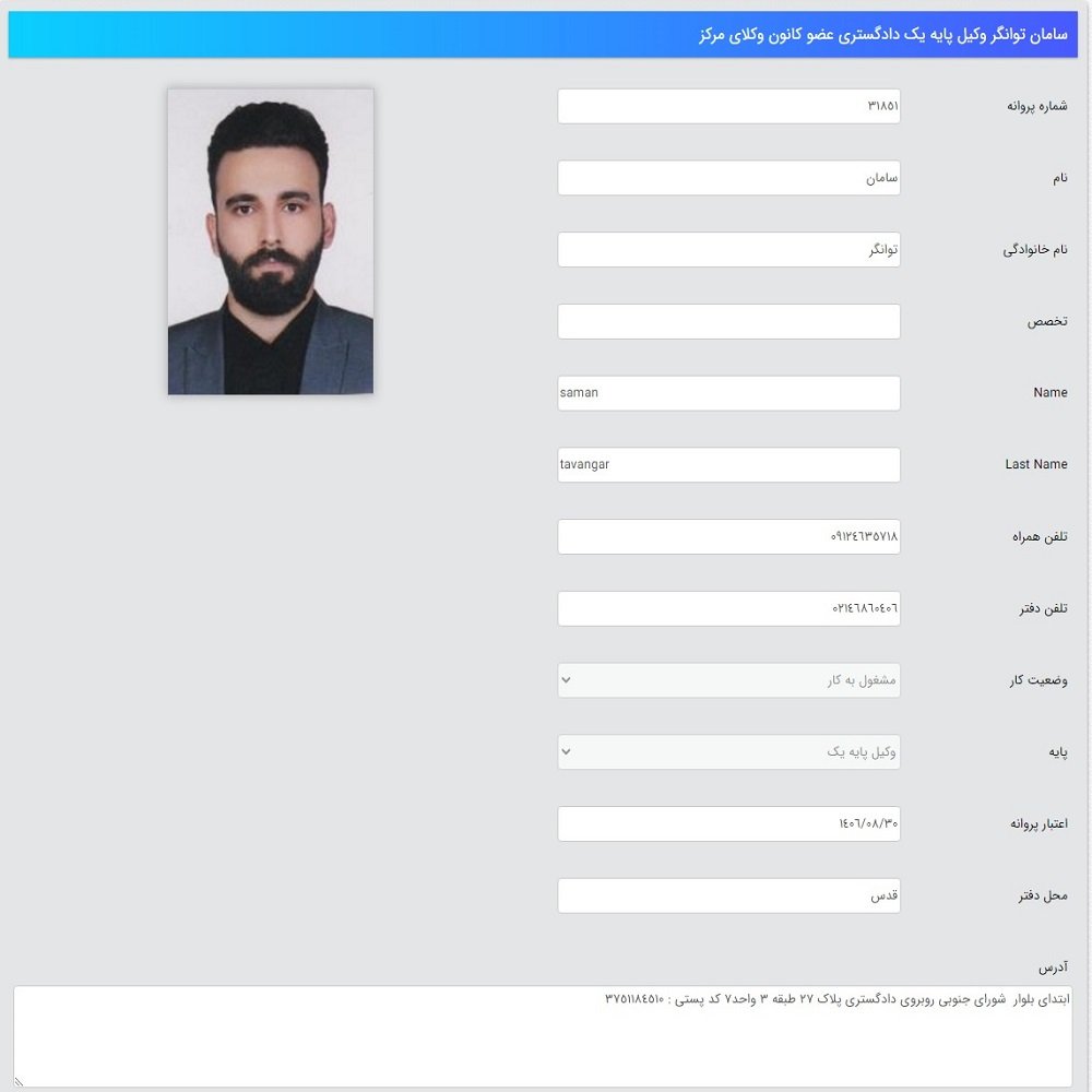 سامان توانگر یکی از وکلای معتبر و مشاوران حقوقی در شهر قدس است. با سال‌ها تجربه در زمینه‌های مختلف حقوقی، ایشان در دعاوی ملکی، خانوادگی، کیفری و مالی توانسته‌اند نتایج موفقی برای موکلین خود به ارمغان بیاورند. پرونده‌های طلاق، مهریه، استرداد جهیزیه، کلاهبرداری و سرقت از جمله حوزه‌هایی هستند که ایشان در آن‌ها تخصص دارند. توانگری با استفاده از دانش حقوقی و تجربیات عملی خود در حل‌وفصل پرونده‌ها، همواره در مسیر کسب نتایج مثبت برای موکلانشان گام برداشته‌اند.