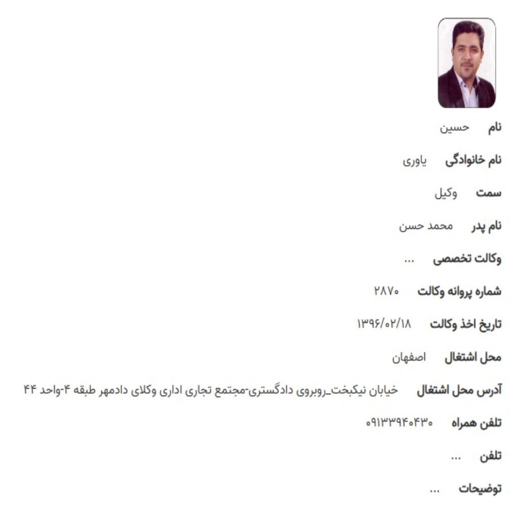 آقای حسین یاوری وکیل پایه یک دادگستری و دارای 10 سال سابقه وکالت هستند. ایشان به عنوان یکی از بهترین وکلای ملکی اصفهان شناخته میشوند. ایشان بنیانگذار و مدیر عامل موسسه حقوقی تفکر برتر در اصفهان هستند. همچنین عملکرد ایشان به عنوان بهترین وکیل ملکی مرد در اصفهان کاملا مشهود میباشد و در نظرسنجی مردمی نیز تایید شده است. ایشان دارای تخصص علمی و کاربردی بوده و در بیش از 1500 مرحله پرونده های مختلف حضور داشته و موفقیتهای بیشماری کسب نموده است.