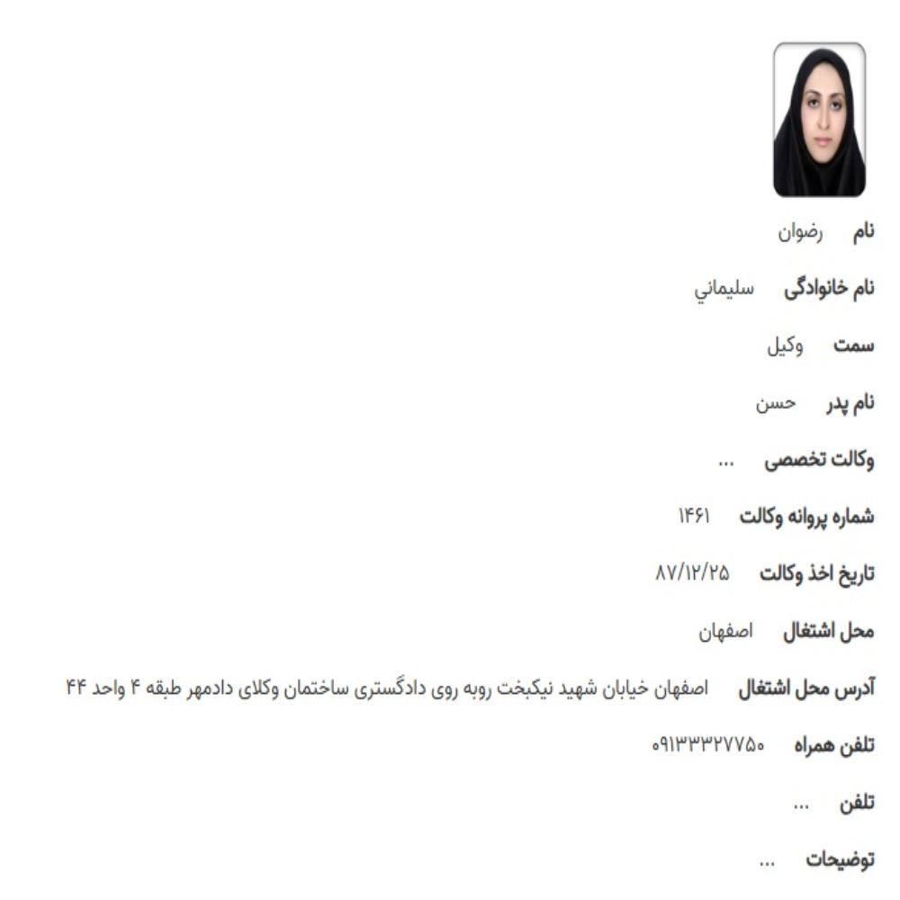 سرکار خانم رضوان سلیمانی با بیش از 17 سال سابقه وکالت در امور حقوقی، کیفری و خانواده توانسته در به ثمر رساندن پرونده های خود موفقیت چشمگیری داشته باشد. ایشان جزو بهترین زنان وکیل اصفهان در حوزه های متفاوت کیفری، حقوقی و خانواده می باشد. تخصص همراه با پیگیری مداوم و همراهی با موکلان در مشکلات پیش آمده و تلاش برای حل آن از مشخصات بارز این وکیل می باشد.