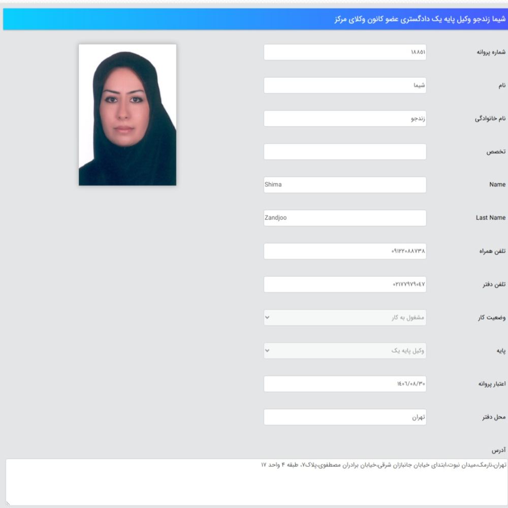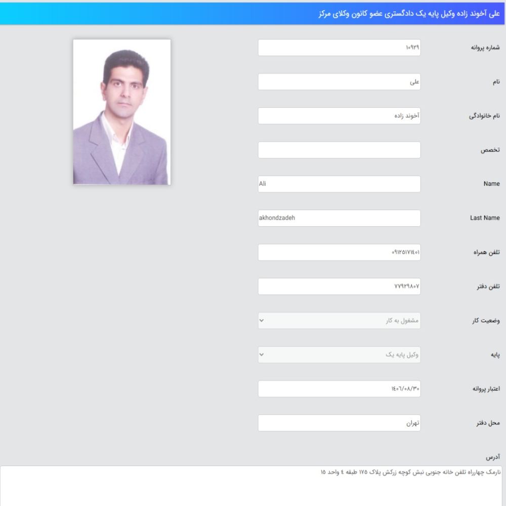 جناب آقای علی آخوندزاده وکیل پایه یک دادگستری، عضو کانون وکلای دادگستری مرکز (تهران)، دارای 20 سال سابقه وکالت در زمینه های مختلف اعم از حقوقی، کیفری، خانواده، ملکی و دعاوی چک و سفته می باشند و چند سال به عنوان نماینده حقوقی سازمان شناسایی ستاد اجرایی فرمان امام (ره) در دادگاه انقلاب مشغول به فعالیت بوده اند و در این مدت مدید فعالیت وکالتی، پرونده های بسیار زیادی در زمینه های فوق الاشعار به ایشان ارجاع گردیده است و در حال حاضر پرونده های مربوط به دعاوی حقوقی، خانواده، کیفری، مطالبه چک و صدور اجرائیه چک، دعاوی ملکی و به صورت خاص دعاوی خانواده، حقوقی، مطالبات و صدور اجرائیه چک را انجام می دهند.