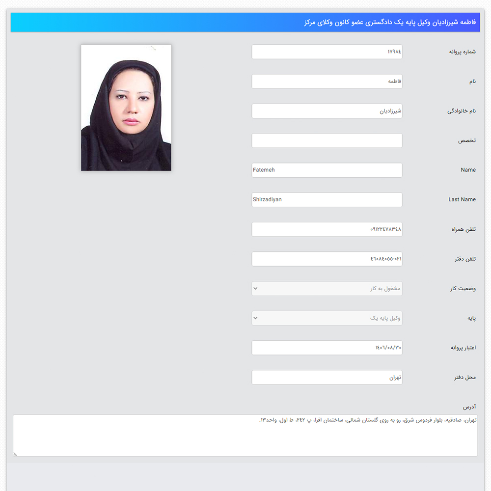 وکیل فاطمه شیرزادیان کارشناس حقوقی و از وکلای تراز اول در زمینه دعاوی ملکی هستتد که با دقت، دانش و مسئولیتپذیری بالا توانستهاند، اعتماد موکلان بسیاری را جلب نمایند. ایشان علاوه بر تخصص در دعاوی ملکی، در زمینه پروندههای خانواده نظیر: طلاق، مهریه و نفی نسب همچنین اختلافات مالیاتی نیز فعالیت برجستهای دارند. سرکار خانم شیرزادیان به دلیل مهارت بالا در تنظیم اوراق قضایی و نگارش لوایح دقیق روند رسیدگی به پروندهها را برای موکلان سادهتر و مطمئنتر پیش میبرند.